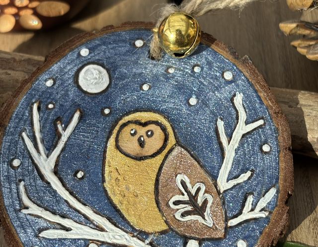 Chouette dans la nuit noire. Avec un peu d'aquarelle paillette pour illuminer votre sapin.
